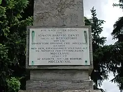 Æreminde efter Døden / for / Johan Hartvig Ernst / Greve af Bernstorff / som gav / udskiftede :::hovningsfrie arvelige /Gaarde / med dem Stræbsomhed Velstand alt / til Mønster for Efterslægten / :::MDCCLXVII / oprettet / af Godsets takfulde Beboere MDCCLXXXIII.