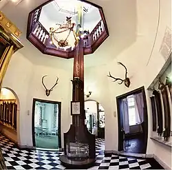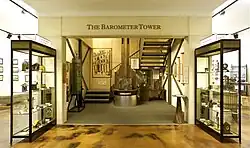 Climbing the stairs in the tower, a selection of antique barometers from Europe was displayed, along with five murals depicting the oldest barometer experiments dating from the 17th century. In the Reading Room, tribute was paid to the pioneers of the barometer, the Italian scientists Galileo Galilei and Evangelista Torricelli. On the ground floor, Bolle had created several interesting physical experiments such as the Atmosphere Simulator, in which artificial highs and lows were created. There was also a bell jar showing interesting vacuum experiments with sound and air.[9]