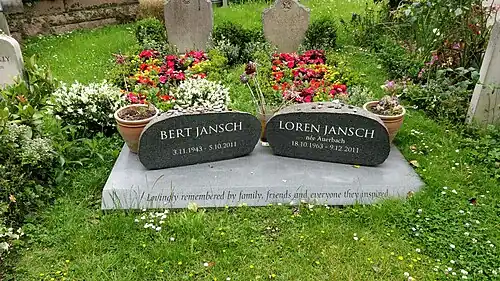 Jansch died on 5 October 2011, aged 67, at a hospice in Hampstead after a long battle with lung cancer.[1][77] His wife, Loren Jansch (née Auerbach), died of cancer on 9 December 2011. They are both buried in Highgate Cemetery.[78]