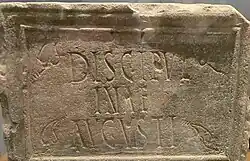 A Roman Altar Stone, inscribed DISCIPVLINA AVGUSTI 'To the discipline of the emperor' was found at the Bertha site near the River Almond in 1958. The cult of military discipline was strongly favored by Hadrian and other emperors from the 2nd century AD onwards. As of June 2025, the stone is on display in the Perth Museum.[9]