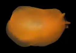 The body is oval and inflated.[3] Dorsum is smooth, covering the internal shell, which is located over the anterior portion of the viscera.[3] The anterior end of the body has a large oral veil.[3] Rhinophores are rolled, emerging between the veil and the dorsum.[3] The color is yellow to orange, semi-translucent.[3] It is up to 25 mm long.[3] Welch (2010) listed that the maximum recorded length is 80 mm.[4]