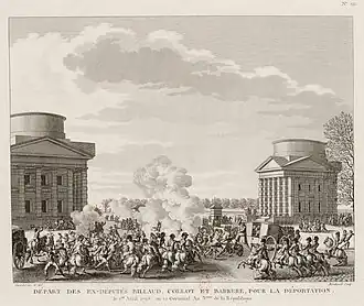Nevertheless, Barère was still questioned on the grounds of being a terrorist. Before Barère was sentenced to prison, "Carnot defended him on the ground that [Barère] was hardly worse than himself."[44] However, the defense proved ineffective. On 2nd Germinal of the year III (22 March 1795), the leaders of Thermidor decreed the arrest of Barère and his colleagues in the Reign of Terror, Jean Marie Collot d'Herbois and Jacques Nicolas Billaud-Varenne.