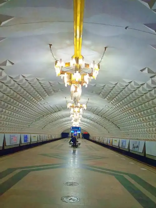 Beruniy is a station of the Tashkent Metro, it is the northwestern terminus of the Oʻzbekiston Line. The station was opened on 30 April 1991 as part of the extension of the line from Chorsu to Beruniy.[1] The station is designed in national traditions of Uzbekistan: the platform hall is decorated by a dome covered with marble patterns. The plant has crystal chandeliers, with all - in the lobby, in the walls of the stairs and in the hall are made in the same style (painter S. Jalilov). Interior wall decoration station is made with marble, granite, metal, glass, porcelain.