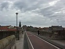 Prior to the construction of the stone bridge, the crossing was served by a series of wooden bridges. which were variously destroyed by flooding and military action.[2][3] James Burrell became Surveyor of Works of the town in 1604, making him responsible for maintenance of the bridge.[4] He was previously also occupied on the fortifications around Berwick before James VI and I ascended the throne of England, rendering them redundant.[4]