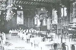 The casino was anchored by a grand dining room, which spanned 25 meters in length and 14 meters in width.[18][8] The dining room was furnished with dozens of tables arranged beneath a Renaissance-style ceiling, adorned with coffered panels and beams. These were supported by statues representing chimeras, and from their mouths hung imposing chandeliers made of nickel-plated copper, which were approximately seven meters in height.[18] The walls were adorned with the most exquisite landscapes of Franche-Comté, attributed to the region's most esteemed painters. These included the rocky outcrops and castle of Thoraise, the citadel as seen from the Micaud promenade, the shadowy islands of the Doubs, and a boating scene in Mazagran at the foot of the Chaudanne hill.[18] The kitchens and private salons were furnished with the latest in culinary and comfort amenities, complementing the installation of a building where the most esteemed chefs were in succession.[19]