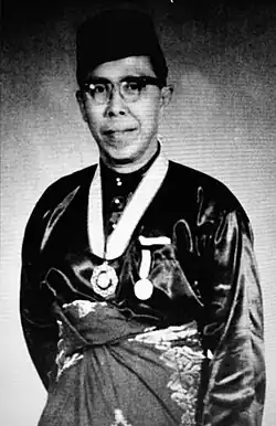 Besar, who at that time of composing the national anthem served in the Public Works Department during the British Military Administration.[3] The idea that Brunei should have its own anthem, like other contemporary countries, began in 1947 among a group of young people. Besar and Pengiran Muhammad Yusuf were chosen to write the hymn; the former wrote the words, while the latter composed the music.[4][5] During Barisan Pemuda's first anniversary celebration on 12 April 1947,[6][7] members sang patriotic songs, including Allah Peliharakan Sultan, contributing to its eventual formal recognition.[8] The anthem, like most songs, saw several versions before being taught to students in a Malay school in Brunei Town.[9] Following Sultan Omar Ali Saifuddien III's coronation in 1950, Brunei's national anthem was formally acknowledged in 1951.[4]