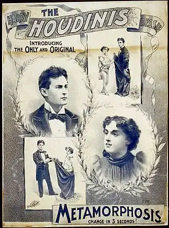 Bess was working at Coney Island in a song and dance act called The Floral Sisters when she was first courted by Houdini's younger brother, Theo (a.k.a. Theodore Hardeen). But it was the older Houdini brother, Harry, that she fell in love with and married on June 22, 1894.[2] The pair worked as The Houdinis for several years before Houdini hit it big as The Handcuff King. But he and Bess continued to occasionally perform their signature trick, Metamorphosis, throughout his career. Bess also looked after their menagerie of pets, collected dolls, and made the costumes for Houdini's full evening roadshow.[3] The Houdinis remained childless throughout their marriage. Bess's niece, Marie Hinson Blood, said Bess suffered from a medical condition that prevented her from having children.[4]