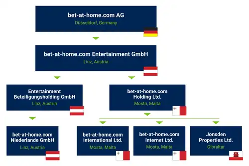 bet-at-home.com AG, Düsseldorf, as the parent company, is listed on the Regulated Market of the Frankfurt Stock Exchange in the Prime Standard market segment. The company holds 100% of bet-at-home.com Entertainment GmbH. This company, with its registered office in Linz, Austria, provides numerous services in the areas of IT, finance, customer management and law for other Group companies. The company’s international licences for online sports betting as well as its online gaming licences for casino and games are held by bet-at-home.com Holding Ltd. based in Mosta, Malta.