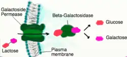 Galactoside permease is a protein coded by the lacY gene of the lac operon, and is found bound to the membrane of a cell for the purpose of binding galactoside molecules that have been solubilized. The protein is part of a system whose main function is to catalyze the accumulation and transport of lactose and other beta-galactosides across the permeable barrier of a membrane. [1][2]