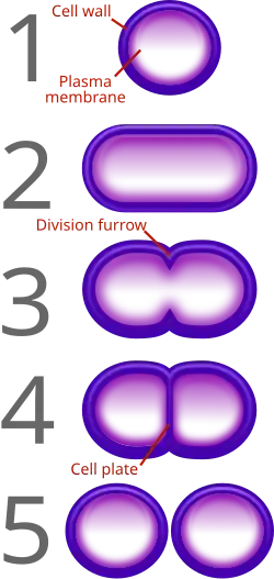 In the absence of β-lactam antibiotics (left), the cell wall plays an important role in bacterial reproduction. Bacteria attempting to grow and divide in the presence of β-lactam antibiotics (right) fail to do so, and instead shed their cell walls, forming osmotically fragile spheroplasts.[12]