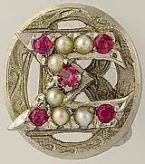 The Beta Sigma Omicron badge was a monogram of the sorority letters, with the Omicron around the Beta and the Sigma superimposed on the Omicron.[9] Its insignia were Stars, Covenant, Lamp, and Laurel. Its pledge pin was a triangle of red enamel, displaying a Grecian lamp and three stars.
