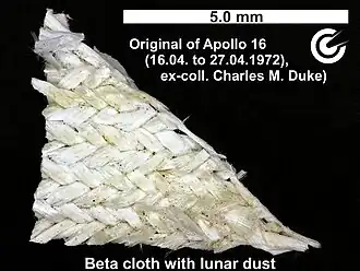 Beta cloth is a type of fireproof PTFE impregnated silica fiber cloth used in the manufacture of Apollo/Skylab A7L space suits, the Apollo Thermal Micrometeoroid Garment, the McDivitt Purse,[1] and in other specialized applications.