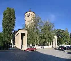 The simple geometric architecture by Zweck and Voigt is in keeping with New Objectivity. The axially symmetrical plastered building is dominated by a 38.6 metres (127 ft) tall round tower. The upper end of the reinforced concrete skeleton tower has earned the church the nickname "lemon squeezer". The tower, which is modeled on Thuringian defense towers such as those of Saaleck Castle[2] and in which the architects saw the embodiment of Luther's words "A mighty fortress is our God", has as its only decoration a 14 metres (46 ft) tall concrete cross that is indirectly illuminated at night.[2] The entrance side of the church is designed like a court of honor[3] and is flanked by two 14.5 metres (48 ft) long staircases with pillar arcades that lead to the church space on the main floor. The two staircases are reminiscent of outstretched arms, which the architects believe is an inviting gesture in keeping with Christ's words "Come to me, all of you" LUT. With an entrance at the front, away from traffic, special accents could be set despite the unfavorable road location.