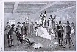 She and her daughter were sold to John Printz Sr. of Luray at Veney's request. She worked for his family until the early 1850s when she was sold to McCoy and his partner John O'Neile. Her daughter remained with the Printz family.[4] When she realized she was about to be sold, she asked a white person from church to purchase her, but she was declined.[27] She was brought to the slave auction in Richmond, Virginia, and she pretended to be sick by putting baking soda in her mouth before bidding began. She foamed at the mouth, and no sale was made.[4][6] Veney worked in the McCoy household and was hired out, in which case she paid McCoy $20 a year and kept the rest of her earnings. She was able to visit her daughter periodically.[4][6]