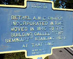 Bethel AME Church and Manse is a historic African Methodist Episcopal church and manse at 291 Park Avenue in Huntington, Suffolk County, New York. The church was cofounded by Peter Crippen and Nelson Smith in 1843[2] and built about 1845 and is a 1+1⁄2-story, wood-frame structure that is rectangular in plan with a gable roof and clapboard exterior. The manse was built in 1915 and is a 2-story, wood-frame structure, with a two-by-two-bay square plan.[3]