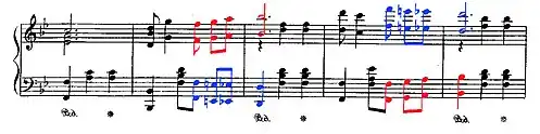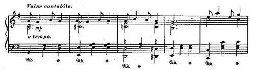 The left hand follows the standard approach of classical waltzes, with a bass note followed by two mid-range chords, and in addition there are some contrapuntal passages[24] where two melodies move independently but complement each other harmonically.[25] For example, the B and C themes are examples of Joplin employing counterpoint in octaves.[21][24] The B theme in the key of B-flat major is closely related to the main theme[19] presenting its counterpoint with the bass and the treble melody lines moving in opposite directions (in contrary motion), to each other and then exchanging their melodies (bars 29-30 and 31–32). This pattern repeats itself during the theme. In the opening phrase (bars 77–81) of the "rag-like"[19] C theme in the key of F major, counterpoint is evident with the harmony of the treble moving in contrary motion to the bass line in a similar way to that used in the B section. In the treble, the harmony falls from F to D, while the bass rises from F to G-sharp[21]