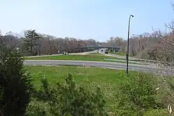 While Central Avenue heads west to Bethpage's commercial center, the parkway bends northeastward into Bethpage State Park and connects to Plainview Road and a local park road by way of a traffic circle. The Bethpage State Parkway ends here while Plainview Road connects to the nearby Seaford–Oyster Bay Expressway (NY 135) and the Bethpage State Golf Course. The entire parkway corridor is served by a bike path that runs along the east side of the Bethpage Parkway, and the path continues northwest from exit B5 along the east side of Plainview Road.[3] The Bethpage Parkway was ceremoniously designated February 27, 1997 as the Philip B. Healey Memorial Parkway for Philip B. Healey, a State Assemblyman from Massapequa who died in May 1996.[4] Healey had served the Massapequa area in the Assembly since 1971.[5]
