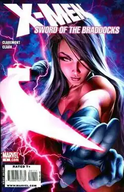 In the Claremont-written X-Treme X-Men #2 (2001), the character dies, her comic book death lasting until 2005's The Uncanny X-Men #455; Claremont also wrote this issue, later stating he had always intended to revive her.[14][15] Briefly, the character was depicted in Exiles, a spin-off comic-book series in the X-Men franchise, set in an alternate universe. With the cancellation of New Exiles, Betsy Braddock starred in her first solo book, the X-Men: Sword of The Braddocks one-shot.[16][17][18] Afterwards, the character was brought back to the main Marvel Universe in early 2009 within the pages of The Uncanny X-Men.[19]