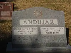 Betty Andujar died on June 8, 1997, and was survived by her husband. As a state senator, she was interred at the Texas State Cemetery in Austin. The widower later married Mary Parker.[10] After his death in August 2003, he was buried by his request next to his first wife at the Texas State Cemetery.[6]