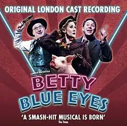 Betty Blue Eyes opened at the Novello Theatre in the West End, London, on 13 April 2011, following previews from 19 March.[5] The production was directed by Richard Eyre, with musical staging by Stephen Mear design by Tim Hatley and orchestrations by William David Brohn. The cast consisted of Sarah Lancashire as Joyce Chilvers, Reece Shearsmith as Gilbert Chilvers, David Bamber as Doctor Swaby, Jack Edwards as Mr Allardyce, Ann Emery as Mother Dear, Mark Meadows as Lockwood and Adrian Scarborough as Inspector Wormold. The voice of the show's animatronic pig Betty was provided by Australian singer Kylie Minogue.[6] Despite positive reviews,[7] the musical closed in London on 24 September 2011, after a run of six months.[8][9]