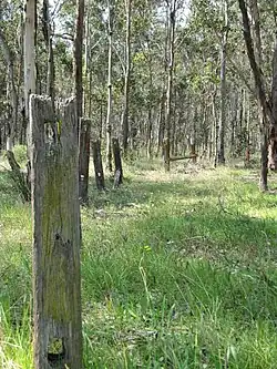 Scott put the property up for auction in Sydney in June 1845. The auction notice declared that "Summer Hill Farm" was entirely "stumped and free for the plough from one end to the other". In addition to a cottage (no longer a 'handsome homestead'!) with dining and drawing rooms, four verandah rooms, detached kitchen and laundry, the improvements included a 'moderate sized barn, men's huts, stables' and "a large tank".[68] The reference to a large tank in this context is a reference to a dam, probably intended to hold water for livestock (The 1833 edition of the New South Wales Calendar and General Post Office Directory notes that Thomas Rose who then owned Mount Gilead, the property to the north of Summer Hill, had been 'the first to construct a tank sufficiently capacious to secure him from the want of water in dry seasons'). Summer Hill was offered as a property that was "desirable as either a country residence for any party desirous of living away from the city, yet within a comfortable drive of it, or, as a dairy or agricultural farm". Interestingly, although offered as 49 hectares (120 acres), it was described as actually being 53 hectares (132 acres) – the discrepancy explained by the creek "having been roughly surveyed as a straight line".[1]