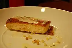 Beurre fondue (French pronunciation: [bœʁ fɔ̃dy]) is a food prepared by melting butter in water.[1] The preparation serves to maintain the butter as an emulsified and creamy concoction.[1] Beurre fondue is used by chefs because it has a lesser feel of greasiness on the palate, and the sauce is also easy for chefs to use compared to whole butter.[1] Its uses are myriad, such as for braising and basting meats, poaching seafood such as lobster, cooking vegetables, and adding flavor to various foods and dishes.[1][2][3][4]