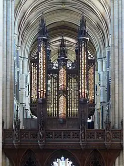 The organ is mounted above a richly carved wooden screen dating from 1877 to 1880, designed by Sir George Gilbert Scott, and carved by James Elwell of Beverley. There is a staircase in the north aisle which was used in collegiate times to gain access to the chapter house, since demolished.