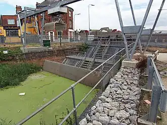 The drain crosses Swine Moor, and then turns to the south-east, to pass under Beverley Beck.[28] The structure is variously described as a bridge, aqueduct or tunnel, and is constructed in red brick with ashlar dressings, having three segmental arches. It has been a Grade II Listed structure since 2001.[29] At Woodmansey, the 60-mile (97 km) Wilberforce Way long-distance footpath, created in 2007, briefly follows first the west bank and then the east.[30] In the final section, the drain is separated from the river first by nurseries and farms, and then by housing as it passes through the outskirts of Kingston upon Hull.[28] A Grade II Listed bridge carries Lockwood Street over the drain. It dates from the late nineteenth century, and is constructed of wrought iron, with cast iron balustrades.[31] Shortly afterwards, the drain discharges into the River Hull at a sluice.[28]