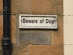 Beware of the dog (also rendered as beware of dog) is a warning sign posted at the entrance to a building or other private area indicating that a dangerous dog is within. Such signs may be placed to deter burglary even if there is no dog, or if the dog is not actually a competent guard dog.[1][2]