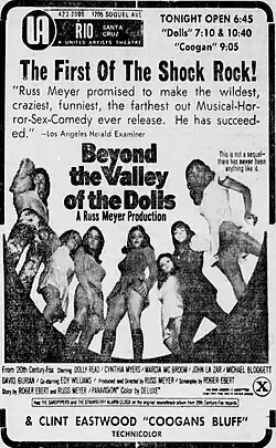 Beyond the Valley of the Dolls is a 1970 American satirical[6][7] musical melodrama film starring Dolly Read, Cynthia Myers, Marcia McBroom, Phyllis Davis, John LaZar, Michael Blodgett, Erica Gavin, and David Gurian. The film was directed by Russ Meyer and written by Roger Ebert from a story by Ebert and Meyer.[8]