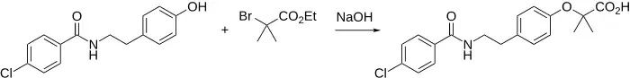 The p-chlorobenzamide of tyramine undergoes a Williamson ether synthesis with ethyl 2-bromo-2-methylpropionate to complete the synthesis. The ester group is hydrolyzed in the alkaline reaction medium.