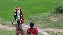 Bhadu gaan, an inseparable part of Bhadu festival reflects the colours of rural society. It used to be very popular in Burdwan, Bankura and Midnapore. But in Birbhum the existence of this unique genre is being threatened by the rising popularity of cinema and television.[4] Bhadu songs are composed extemporaneously and sung on each night of the festival, depicting the Goddesses as young girls. They describe Bhadu and tell in loving detail how they will be entertained. Since Bhadu is unmarried, her songs are sung mostly by unmarried girls. Dancing and playing drums accompanies Bhadu.[5]