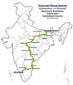The 12577 / 12578 Bagmati Superfast Express is a weekly Superfast Express train from Darbhanga in Bihar to Mysore in Karnataka, a 3036 km long route and it is operated by Indian Railways–East Central Railway zone. It is the only direct train from Mysuru in Karnataka and darbhanga in Bihar