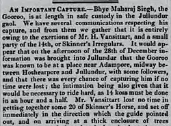 The surveying was completed and he next decided to make way to Adampur.[10] This would prove to be a mistake of the increasingly salient Maharaj Singh.[12] There existed a 10,000 rupee bounty placed against Maharaj Singh, either dead or alive.[2][12][5] This was the largest bounty reward amount for any outlaw of that period by the British.[5] A Muslim informer reported his location to local authorities.[10] Amardeep Singh believes whoever turned him in probably did so for financial reasons as the reward amount was a hefty sum for that time, enough to transform someone's life.[5] He was arrested at Adampur in a sugarcane field along with 21 of his followers on 28 December 1849 by Henry Vansittart.[2][1][10][3]
