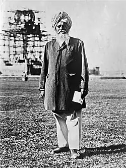 In 1885-7 he worked with Kipling, decorating the "Indian Passage" and ballroom at Bagshot Park for the Duke of Connaught, Queen Victoria's third son, who he had met in India when the duke was Commander-in-Chief of the Bombay Army from December 1886 to March 1890.[6] This led to the Osborne House commission, and other work in Britain. Queen Victoria met him when he was working at Osborne in January 1891 and her diaries describe him as "a very intelligent, pleasant, nice man, a Seikh [sp. 'Sikh']; we looked at sketches he had made for the decoration of the room".[3] He became Principal of Mayo School of Arts in 1910 and the following year he was made an MVO (Member of the Royal Victorian Order by King George V.[3] He retired in 1913 and died in Lahore, three year later in 1916 aged 58.