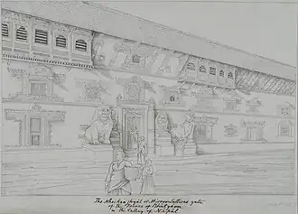 There are two other extant Narayana temples in the square built as Shikhara.[63] The extinct Narayana temple built as a small two storey pagoda was commissioned by Ganga Rani and was located on the immediate south of the western corner of the Nhēkanjhya Lyākū palace where the National Art Gallery is housed today.[64] Ganga Rani was a queen regnant of Bhaktapur who jointly ruled the kingdom with her sons from 1559.[65] The only known visual depiction of the lost temple are two paintings done by Oldfied in 1853.[64] It was likely demolished in 1856 by the then magistrate of Bhaktapur, Dhir Shumser as the temple does not appear in future paintings or photos.[64]