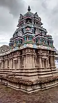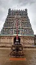 The temple is believed to be of significant antiquity and is believed to be initiated by the Medieval Cholas of the late 9th century CE, with later contributions at different times from Thanjavur Nayaks. The temple has three inscriptions dating from the Chola period. The temple has a five-tiered rajagopuram (gateway tower) and enshrined within a granite wall. The complex contains all the shrines and the temple tank is located outside the main entrance of the temple.