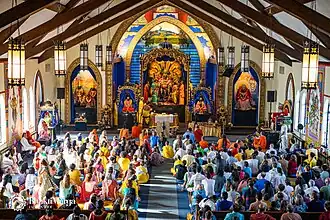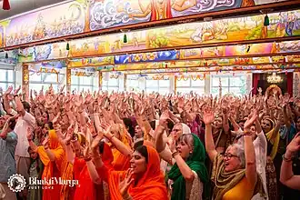 Every Bhakti Marga ashram has at least one temple, which in turn often contains several idols representing deities.[7] In addition to various Hindu deities, Vaishnava and non-vaishnava, Babaji and Ramanuja are worshipped as gurus in the main temple in Springen.[21] The main deities in Sri Vaishnava are Narayana and Lakshmi,[46][47] who are also worshiped in the Bhakti Marga temples.[48][4] However, many other deities are also worshiped, some of which belong to the Vaishnava pantheon (Radha and Krishna), but some of them do not. This worship of non-vaishnava gurus and deities, like Shiva and Durga,[49] distinguishes Bhakti Marga from other Vaishnava traditions, such as Shri Vaishnava, or Gaudiya Vaishnava, which is known in western countries mainly through the Hare Krishna movement.[1][50] Bhakti Marga initially incorporated a syncretistic system of Hinduism with Christianity in their temples, including having crosses, icons, and the figure of Jesus.[51][8] However, in recent years, the organization has distanced itself from Christian philosophy.[52] Bhakti Marga displays classically diasporic features, such as a willingness to absorb aspects of Christianity and to recruit non-ethnic PIO disciples. According to the Mauritius website (Bhakti Marga Mauritius 2013, p. 1), Sri Swami Vishwananda “teaches to go beyond the boundaries of religions and to experience the Divine reality beyond the conceptual differences."[21]