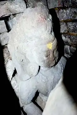 Bhaktapur, being a former capital of a Newar kingdom, contains one of the most elaborate art pieces of Nepal.[3] Only a few artworks from the Lichhavi dynasty survive in Bhaktapur and so most art pieces date from the Malla dynasty. Most of Bhaktapur's art were religious in nature and were made by anonymous artists coming from a caste of artisans.[86] A few artisans however are known. For instance, the painter who made the murals on the walls of the palace of fifty windows has signed his name on one of the murals.[87] However, many of the murals in the palace were damaged when it used as a post office and a police station in the 20th century and the painter's signature has unfortunately been rubbed off, with only his address remaining readable today.[87]