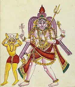 Bhikshatana is often pictured with four arms in South Indian iconography. The front right arm is stretched out downwards and the hand holds a bit of grass or another plant in the kataka gesture, near the mouth of his pet deer or antelope, who leaps playfully by his side.[28][29][31][32] The back right arm is raised and holds a damaru (drum). The front left hand holds a kapala (skull-cup), used as a begging bowl. The back left hand holds a trishula decorated with peacock feathers. The left leg is firmly rooted in the ground while the right one is slightly bent, suggesting walking.[28][30] He often wears paduka (wooden sandals) but sometimes may be barefoot.[28] The sandals are unique and identifying feature of Bhikshatana's iconography and distinguish him from other forms of Shiva and all other deities, who are always depicted barefoot.[29][33] Sometimes Bhikshatana's iconography is amalgamated with that of Bhairava, in which case he displays Bhairava's attributes in addition to his own.[33][34]