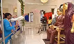 Every year, millions of Ambedkar's followers, Buddhists and other tourists visit this place, especially on 14 April and celebrated Ambedkar's birthday with pomp and gaiety.[6] Mhow is 216 km away from Bhopal and 20 km away from Indore. In this place, the Prime Minister of India Narendra Modi had visited the 125th Ambedkar Jayanti in 2016 to pay tribute to Babasaheb.[7][8] In 2018, the 127th Ambedkar Jayanti, the President of India Ram Nath Kovind tributed Babasaheb by visiting Mhow.[9][10][11] This memorial is one of the Panchteerth, five holy sites related to the life of Babasaheb Ambedkar.[12] The Madhya Pradesh government organizes 'Samajik Samrasta Sammelan' every year at Ambedkar Jayanti in Mhow. Apart from this, various social and cultural programs are organised here.[13]