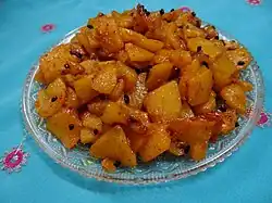 - Tarua / bajka – sliced vegetables like potatoes, plantain, lauki (gourd), brinjal, parwal, and kohda (pumpkin) are coated with a batter of besan, chana dal, or rice flour to make crunchy fritters.[44]