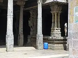 The central shrine houses the presiding deity Varaha (Bhu Varahaswamy). The 2 ft (0.61 m)-shaligrama stone image depicts the boar-faced Varaha standing in a victorious posture with his hands on his waist; the human body faces West, while the head is turned towards the South. The utsavar (festival icon), Patharaavi, is made of panchaloha (a five-metal alloy) and is accompanied by two consorts as in most Vaishnava temples. The festival icon is housed in the Artha Mandapa, the hall before the sanctum.[6] The temple has two dvarapala (guarding deities) on both sides of the entrance of the central shrine made of panchaloha, one of which is commissioned during the modern times. The older one on the left side was confiscated during the Mysore war and was having a wooden replica till it was replaced in 2004.[7]