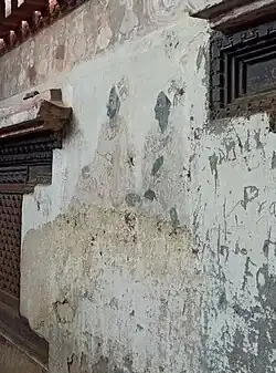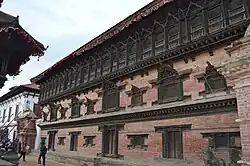 The palace of fifty five windows (Nepal bhasa: 𑐒𑐾𑐒𑐵𑐥𑐵𑐗𑑂𑐫, ngé ngāpā jhya) was the remodeling of a palace first constructed by King Jayayakshya Malla which was damaged in the earthquake of 1681.[110] Bhupatindra later remodeled the palace with fifty-five windows and today is considered a great example of Nepalese woodcarving.[110] There is one misconception that Bhupatindra Malla built the palace with fifty-five windows to provide one for each of his fifty-five wives.[111] However, there isn't much evidence to support this as Bhupatindra likely only had a single queen. Moreover, the palace was likely made for musical purposes as supported by the recent discoveries of 147 carvings of musical rāgas and their names on the cornice separating the ground floor and the first floor of the palace.[112][113]