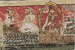 The construction of this palace was completed in 1708 after which Bhupatindra Malla had a Chitrakar paint frescoes on the second floor.[114] The walls on the second floor of the palace are painted with Paubha paintings depicting various religious scenes and the portraits of the royal figures.[114][115] The central fresco contains a portrait of Vishvarupa and his consort.[62] The Vishvarupa has multiple layers of head while the mythical Mount Meru forms the background.[114] The central head of the Vishvarupa has the face of Bhupatindra Malla.[62][114] On one of the eyebrows of the figure, the snake king and his army of serpents is seated.[114] Similarly, on the two shoulders of the Vishvarupa stand Ganesha and Kumara while the chest of the Vishvarupa contains a scene from the Ramayana where Rama and his allies are seated in a golden chariot and are fighting a ten headed Ravana and his army.[114] A lotus plant sprouts from the navel of the Vishvarupa, where the creator deity Brahma is seated.[114] Brahma is being attacked by demon forces of Madhu and Kaitavya and is being defended by Shiva and his divine army.[114] Similarly, the Vishvarupa is embracing a female figure who has a white complexion and a distinctive nevus on her chin, identifying her as Queen Vishva Lakshmi.[114] Similarly, her ribbon which forms an elaborate headwear contains the word 'Sri Bhupatindra' written in the Newari script, further identifying her as Bhupatindra's queen.[62][114] Vishva Lakshmi is embracing her consort with her left arm while her right arm which holds a golden cup, contains a gold bangle the upper part of which has been modified into the figure of a blue coloured Bhairava and his consort Bhairavi.[114] The Vishvarupa painting although heavily damaged has been described as the epitome of Nepalese painting and one of the rarest in the world.[114] Historian Purushottam Lochan Shrestha further writes that: