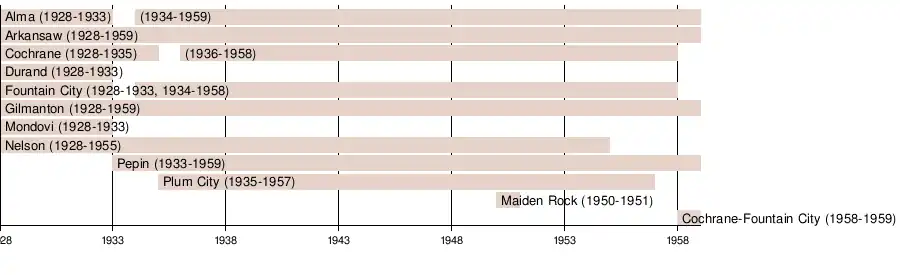 The Bi-County League’s membership was whittled away by rural school district consolidation in the 1950s, starting with Nelson’s closing and redistricting to Durand in 1955.[10] Two years later, Plum City left for membership in the Dunn-St. Croix Conference,[11] and after the merger of Cochrane and Fountain City in 1958,[12] the conference was left with only five members.[13] The Bi-County League was dissolved in 1959, with four schools (Alma, Arkansaw, Gilmanton and Pepin) forming half of the new West Central Conference[14] and Cochrane-Fountain City becoming members of the Mississippi Valley Conference.[15]