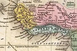 Early modern maps of Africa from the 15th to the 19th centuries, drawn from accounts written by explorers and travellers, show references to Biafar, Biafara, Biafra,[14][15] and Biafares.[16] According to the maps, the European travellers used the word Biafara to describe the region of today's West Cameroon, including an area around today's Equatorial Guinea. The German publisher Johann Heinrich Zedler, in his encyclopedia of 1731, published the exact geographical location of the capital of Biafara, namely alongside the river Rio dos Camaroes in today's Cameroon, underneath 6 degrees 10 min latitude.[17] The words Biafara and Biafares also appear on maps from the 18th century in the area around Senegal and Gambia.[18]
