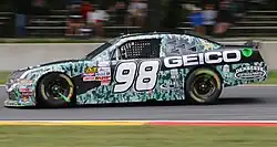 In 2014, the team returned again with veteran David Ragan as well as up-and-comers Jeb Burton and Corey LaJoie; all three are the sons of former racers. Drive for Diversity and NASCAR Next member Ryan Gifford was signed to run two races for the team: Iowa in May and Kentucky in June.[9] Gifford finished 20th in his only appearance at Iowa. After winning the Coke Zero 400 at Daytona and earning a spot in the Chase for the Sprint Cup, Aric Almirola signed on to pilot the 98 during two companion races at Chicagoland and Dover in September. Cup sponsor Smithfield Foods would come on to sponsor Almirola's efforts.[10] Almirola started 10th and finished 14th in his debut for the team at Chicagoland, then 13th at Dover. After running one race earlier in the year, it was announced that Corey LaJoie would return to the No. 98 car for four additional races (Kansas, Charlotte, Texas, and Homestead), with backing from Richard Petty Motorsports primary investor Medallion Financial.