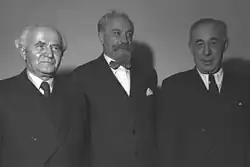 ![]() Photo from the 1952 Bialik Prize award ceremony. From left to right: awardees David Ben-Gurion and Zalman Shneor, followed by Tel Aviv mayor Israel Rokach. | |
