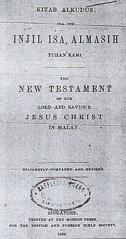 - ^ a b Hunt, Robert (June 1989). "The History of the Translation of the Bible into Malay" (PDF). Journal of the Malayan Branch of the Royal Asiatic Society. 52 (1): 35–56. Retrieved 20 April 2019.